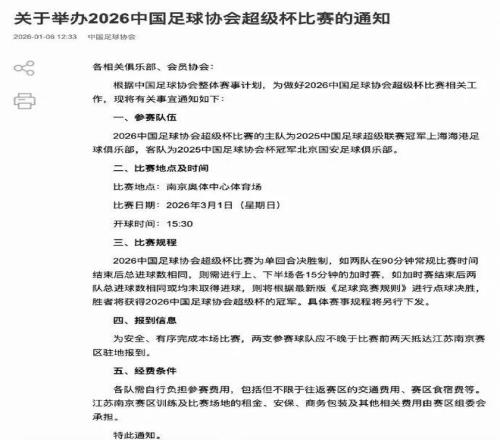 中国足协今天在官网发布通知:2026中国足协超级杯比赛将于年3月1日(星期日)15:30开球,比赛地点为南京奥体中心体育场。对阵双方为上海海港(2025中超冠军)与北京国安(2025中国足协杯冠军)。