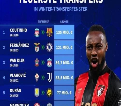 德转列冬窗历史最贵交易榜:库鸟居首,塞门约7200万欧第七 -